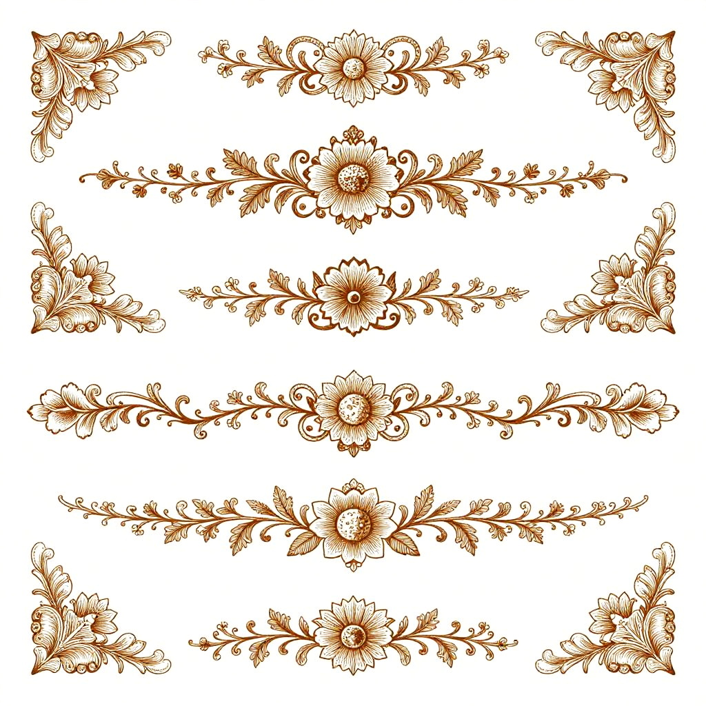 Vintage dingbat inspired ornamental borders and decorative elements, intricate line art with floral and fauna motifs, elegant Victorian style design, warm sepia tones, detailed engraving style, ideal for book cover or stationery design, high resolution.