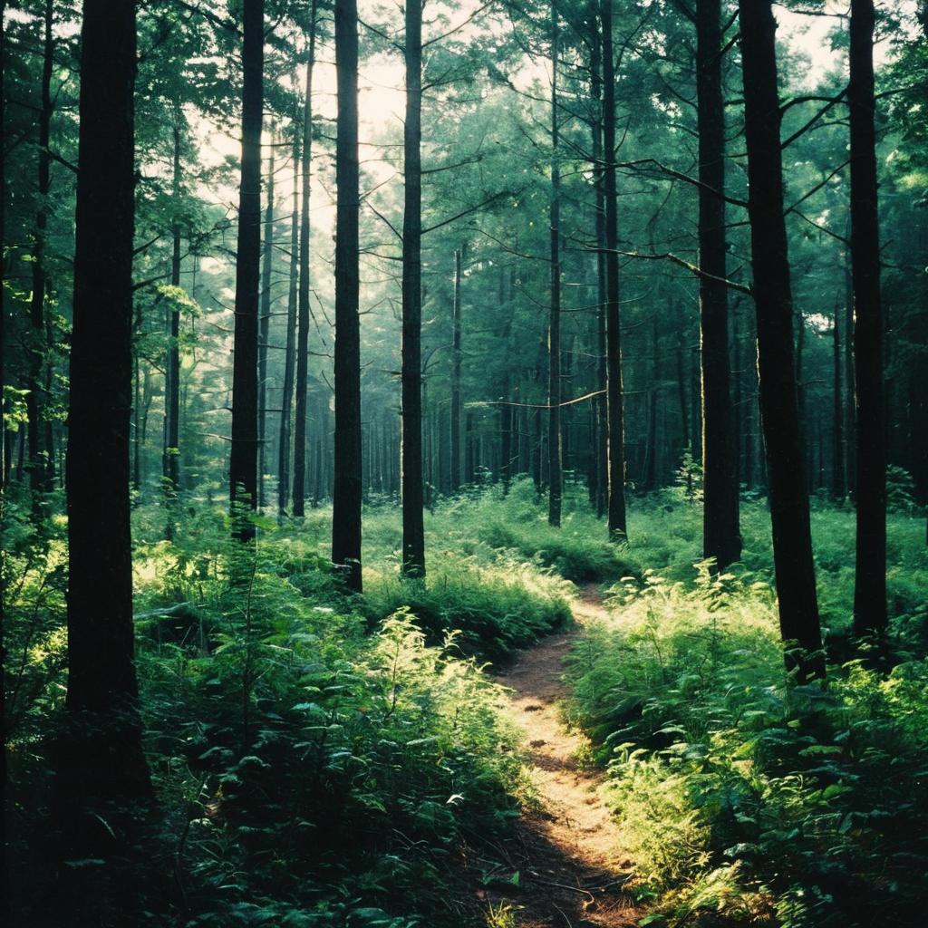 Dense forest bathed in early morning light with tall trees and lush green foliage. Sunrays filter gently through the tree trunks, illuminating ferns and undergrowth in a serene summer forest setting.