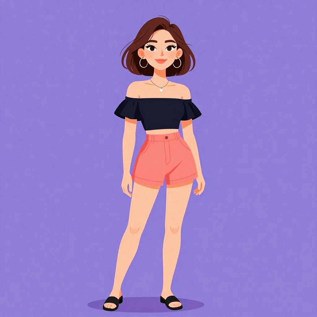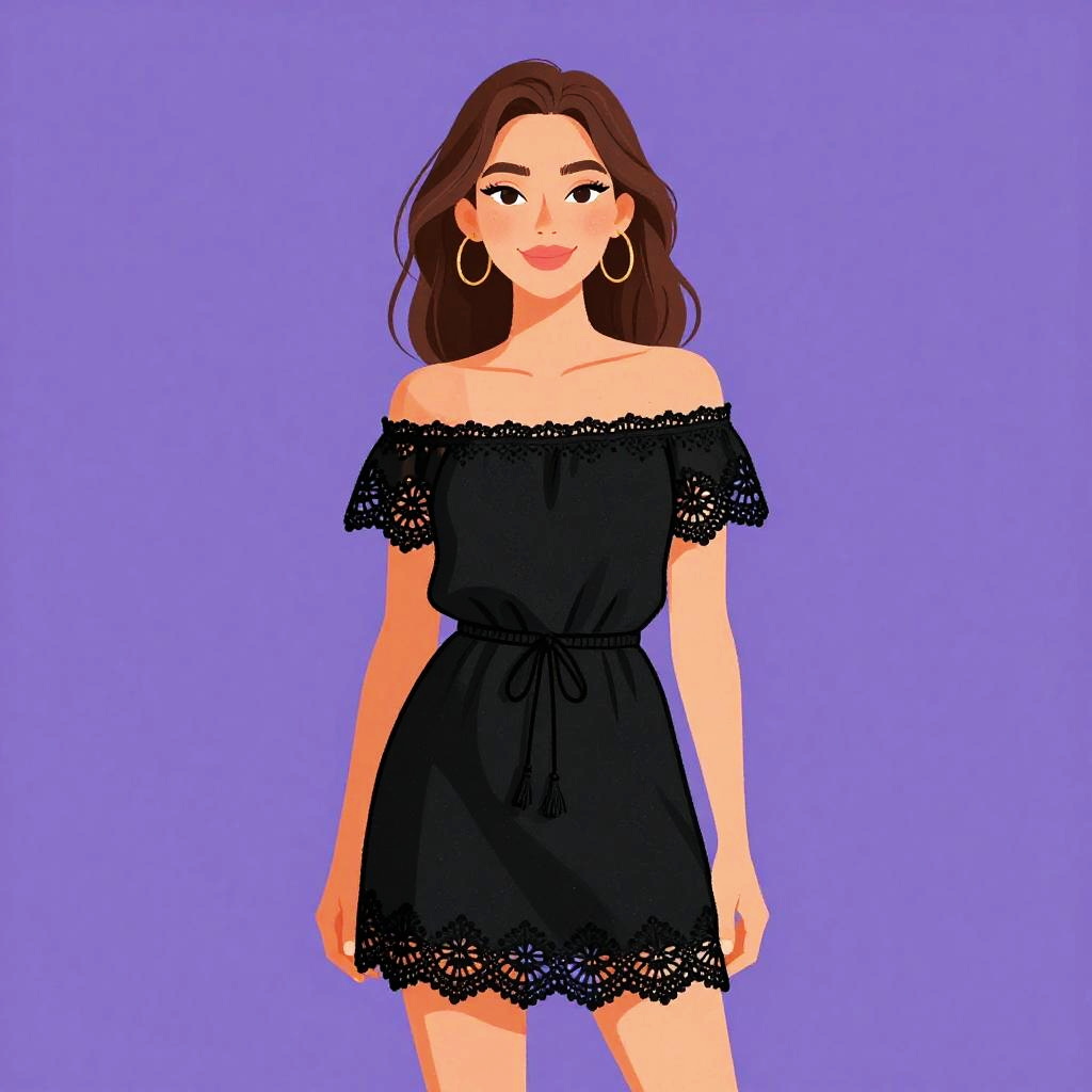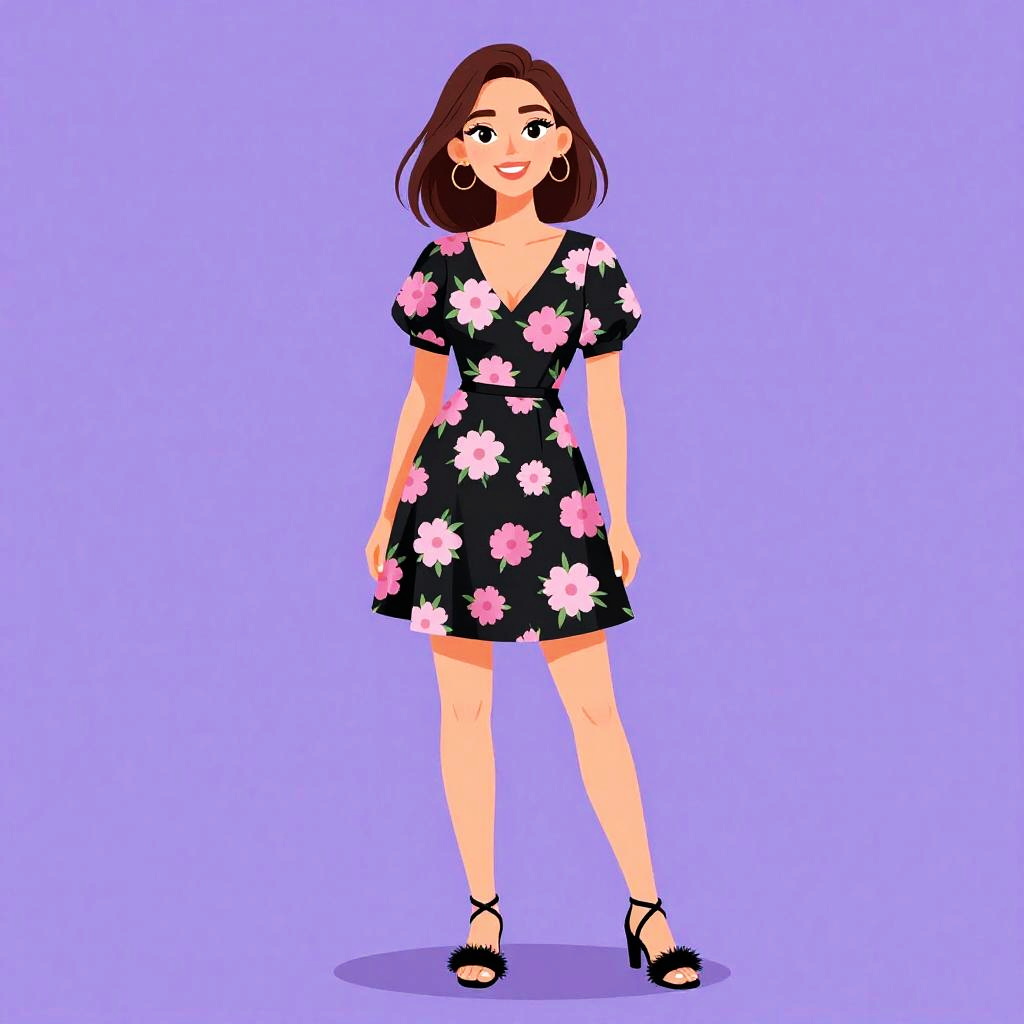 Woman with pretty face and pretty hair. Woman, bohemian, cold-shoulder dress with a black base and pink floral patterns, tassel ties at the neckline, three-quarter length sleeves with elastic cuffs, cinched elastic waist, short hemline above the knee, black ankle boots, plain background in a photography studio setting. --sref 1467