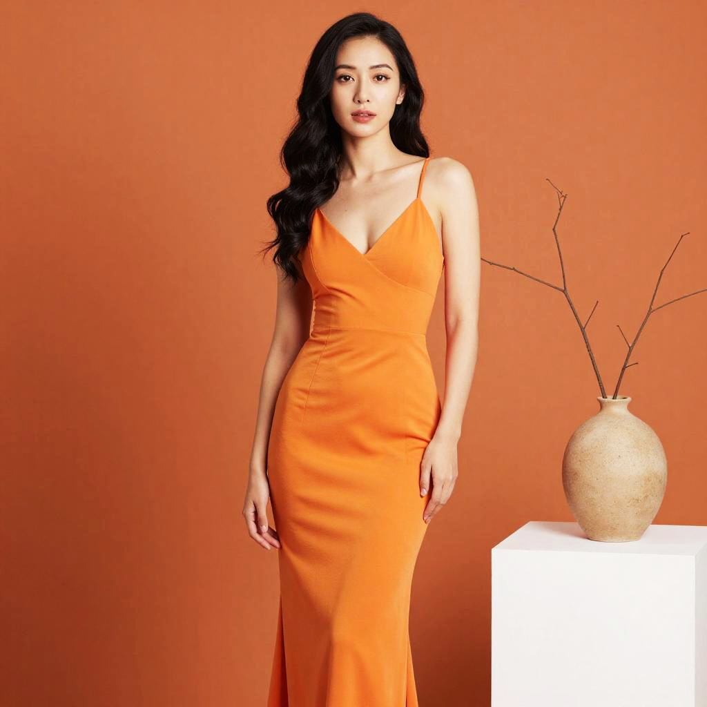 This vibrant image features a stylish woman dressed in a stunning orange gown, set against a bold orange backdrop that enhances the striking color palette. The contemporary aesthetics, highlighted by minimalist decor, create a perfect blend of sophistication and modernity.