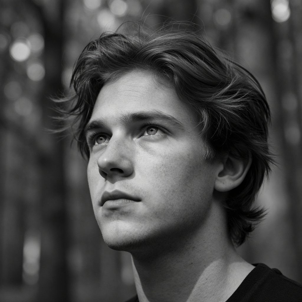Black-and-white close-up photograph of a young man with tousled hair, gazing upward, blurred forest background, intense expression.