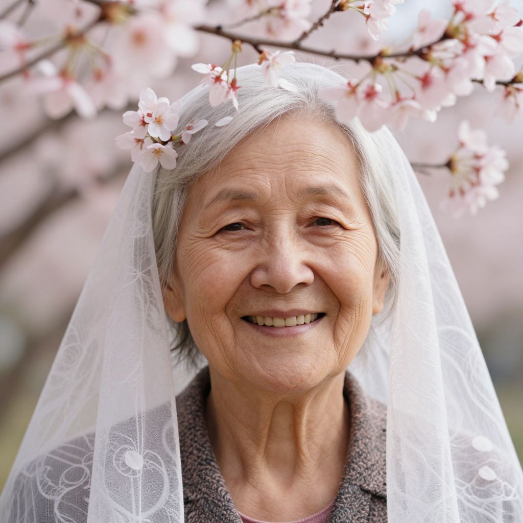 Photograph of an elderly Asian woman with gray hair, smiling warmly. She wears a white, translucent veil adorned with a pink cherry blossom hairpiece, and a gray, patterned blouse. Her skin is wrinkled, showcasing her age, and she has a gentle, kind expression. In the background, blurred pink cherry blossoms create a soft, springtime setting. The focus is on her face, with the cherry blossoms providing a delicate, colorful contrast. The image exudes a sense of serenity and joy.