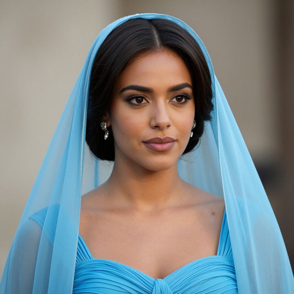 Photograph of a beautiful South Asian woman with dark hair, wearing a light blue veil and matching dress, with delicate earrings, smiling softly against a blurred