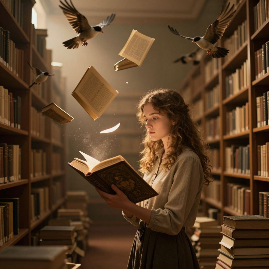 In a hushed library bathed in golden light, a young woman cradles an ancient tome amidst a cascade of books defying gravity, their pages rustling like whispers of forgotten wisdom while birds take flight, symbolizing the liberation of knowledge and the boundless pursuit of understanding.