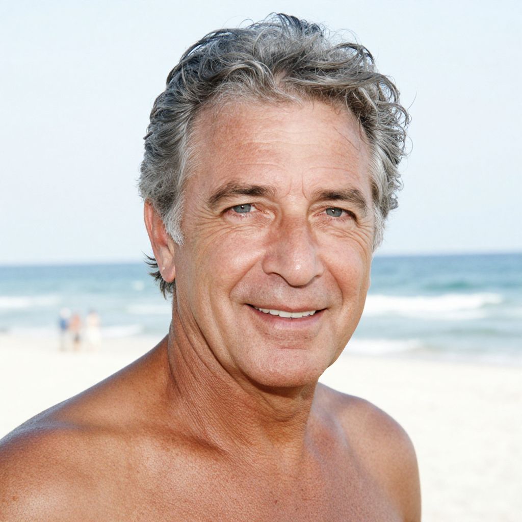 Waterproof Ink portrait of a beautiful older man with tan skin, grey hair, and blue eyes smiling while at the beach, 1998, disposable camera,