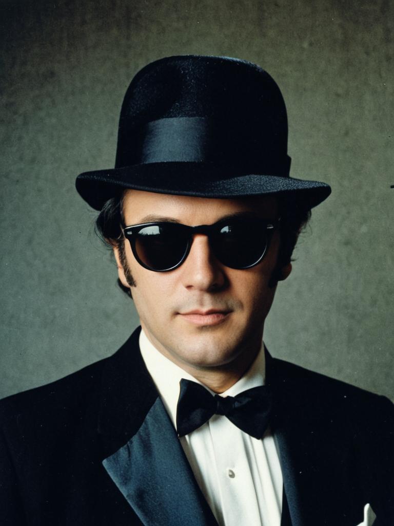 Man in Blues Brothers Fancy Dress costume, cinematic realism, sharp portrait