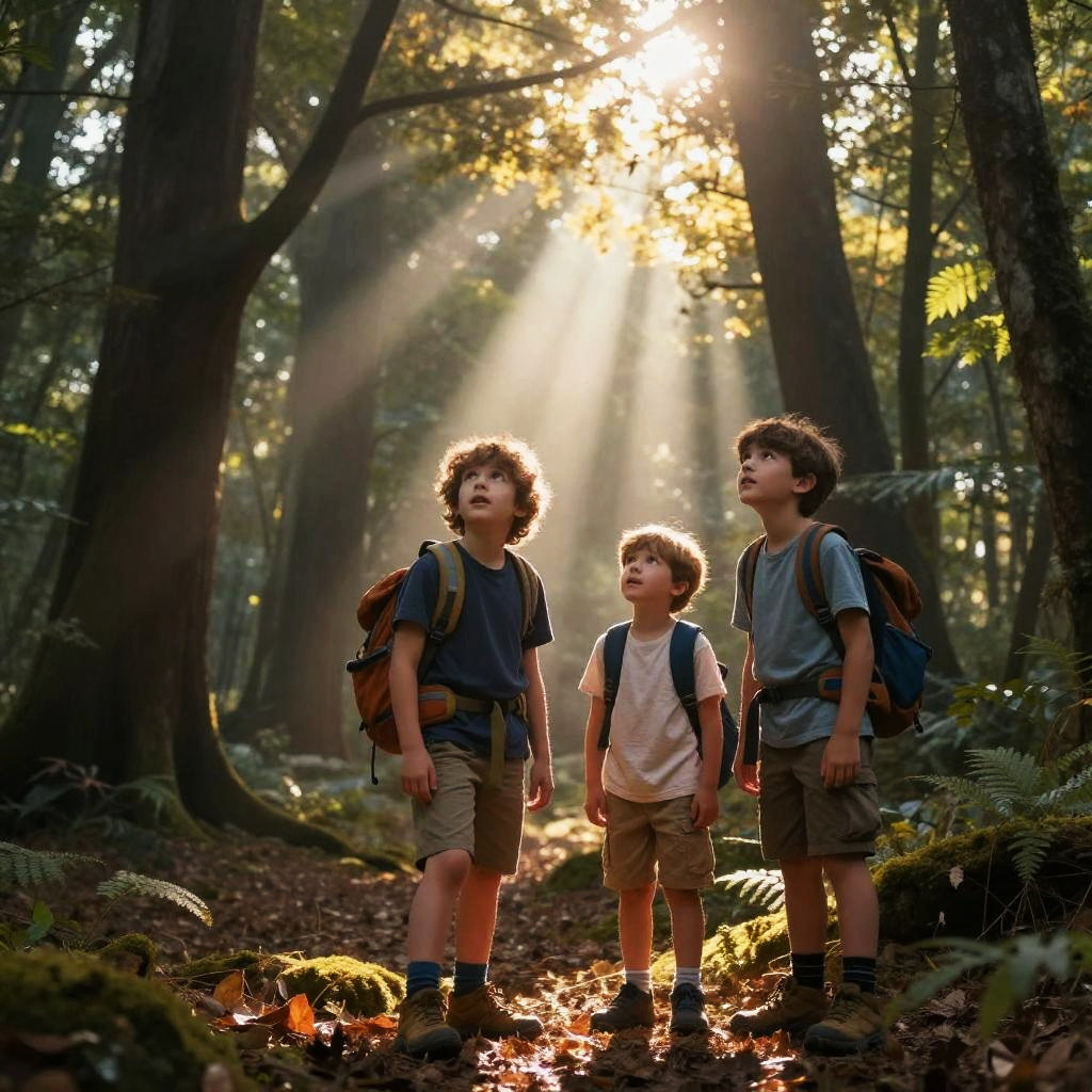 Children Exploring Mystical Forest at Dawn