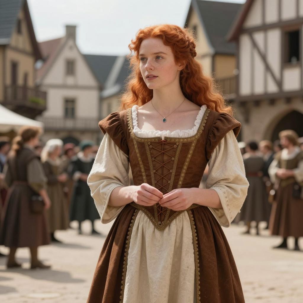 Renaissance faire chemise, photo of a redheaded woman with long hair, wearing a brown and cream Renaissance-style dress with a corset and puffed sleeves, standing in a medieval town square, crowd in background, sunlight, medieval architecture, realistic, detailed, daytime, historical costume, soft lighting, natural colors