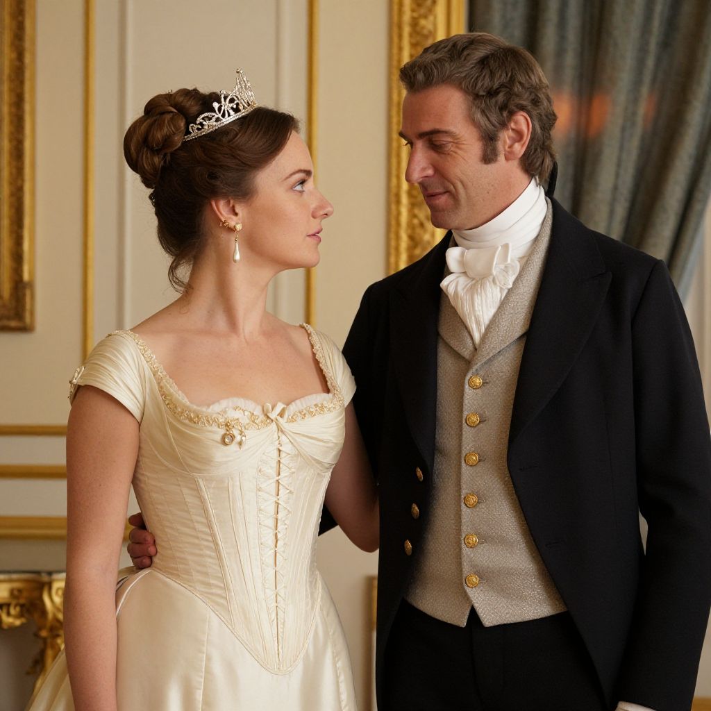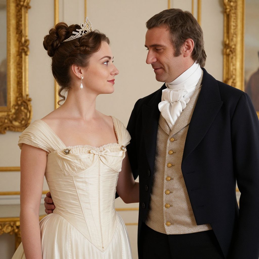 Elegant historical figures stand side by side in a warmly lit room, with a woman in a cream corseted gown adorned with a tiara and pearl earrings gazing at a man in a dark suit with a white cravat and vest featuring gold buttons, both exuding an air of sophistication and intimacy.