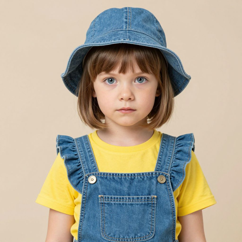 Photograph of a young Caucasian girl with fair skin, straight brown bob-cut hair, and large blue eyes. She wears a blue denim bucket hat, a yellow short-sleeved shirt, and blue denim overalls with silver buttons. The background is a plain, light beige color, putting full focus on the child. Her expression is neutral, with slightly parted lips and a direct gaze at the camera. The image has a crisp, clear quality with vivid colors.