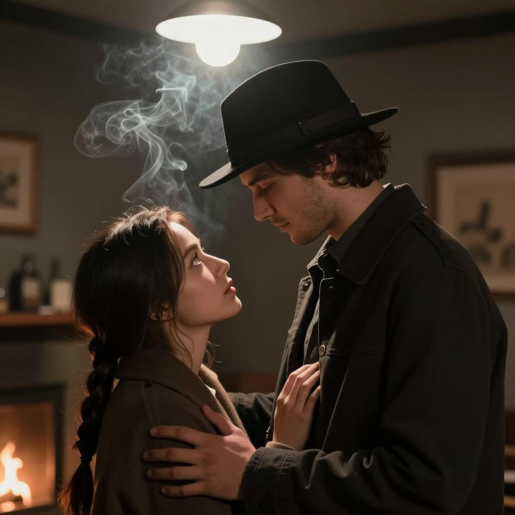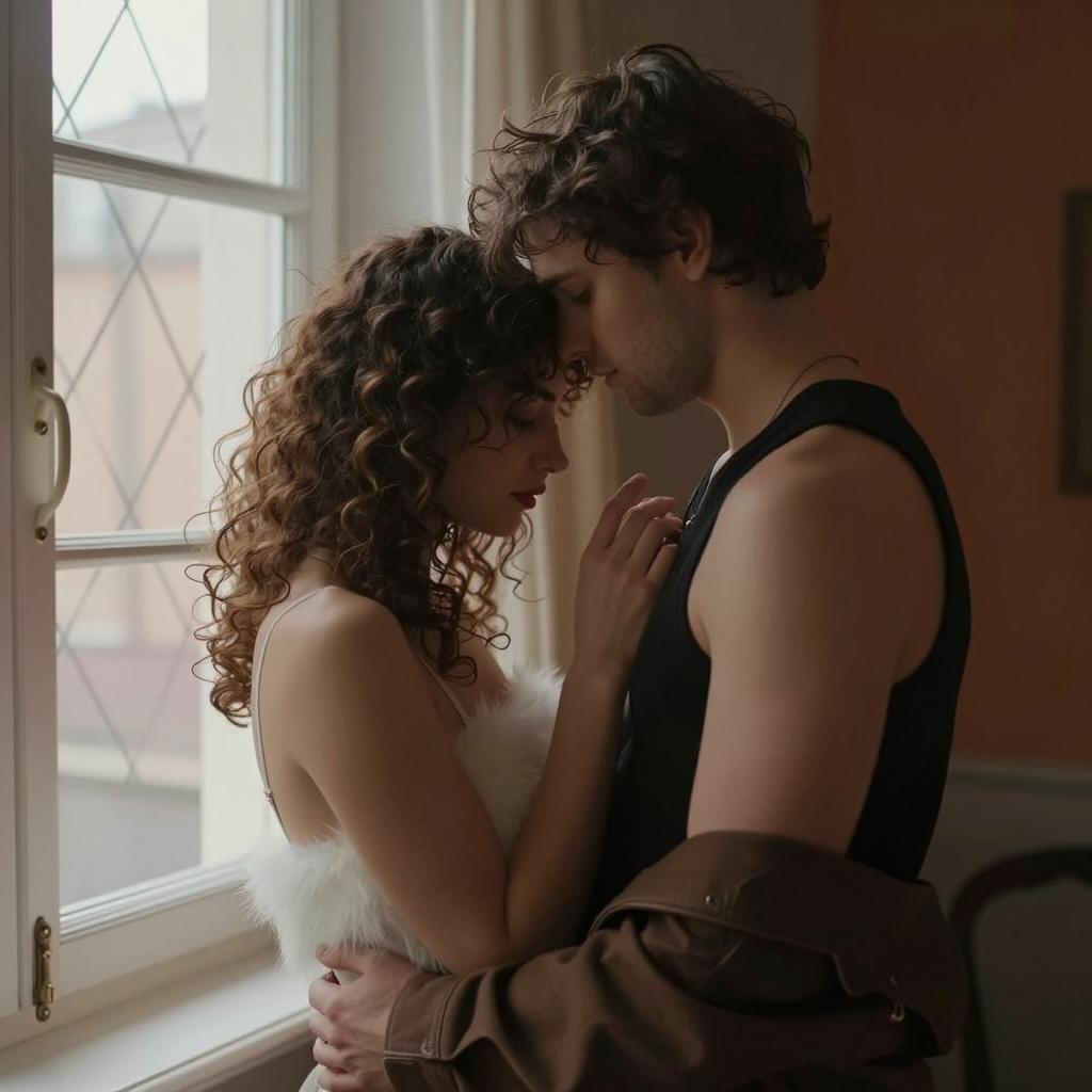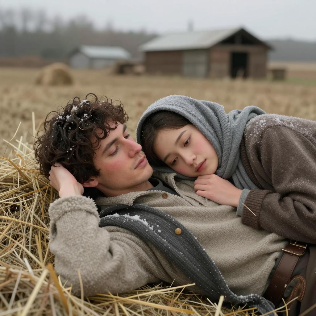 Two people lying in a hay pile. Both have dark, curly hair, and wear woolen clothes with snow-like ure. The man looks at the woman, who is resting her head on his arm. Hay dominates the background. Faint, blurred farm structures are in the distance. Both wear gray headscarves. The man's expression is gentle, the woman's is relaxed. The man's face is slightly flushed.