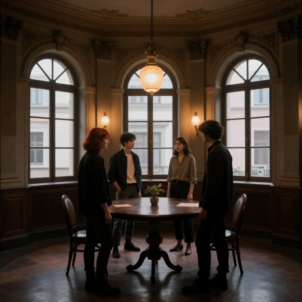 A group of four young adults standing around a round wooden table in an ornately decorated, dimly lit room. The room features three large arched windows with intricate molding, warm hanging and wall lamps, dark wooden accents, and a tiled floor. The group includes two individuals with red hair and two with dark curly hair, dressed in casual to semi-formal attire. A small plant is placed on the table, contributing to the intimate atmosphere.