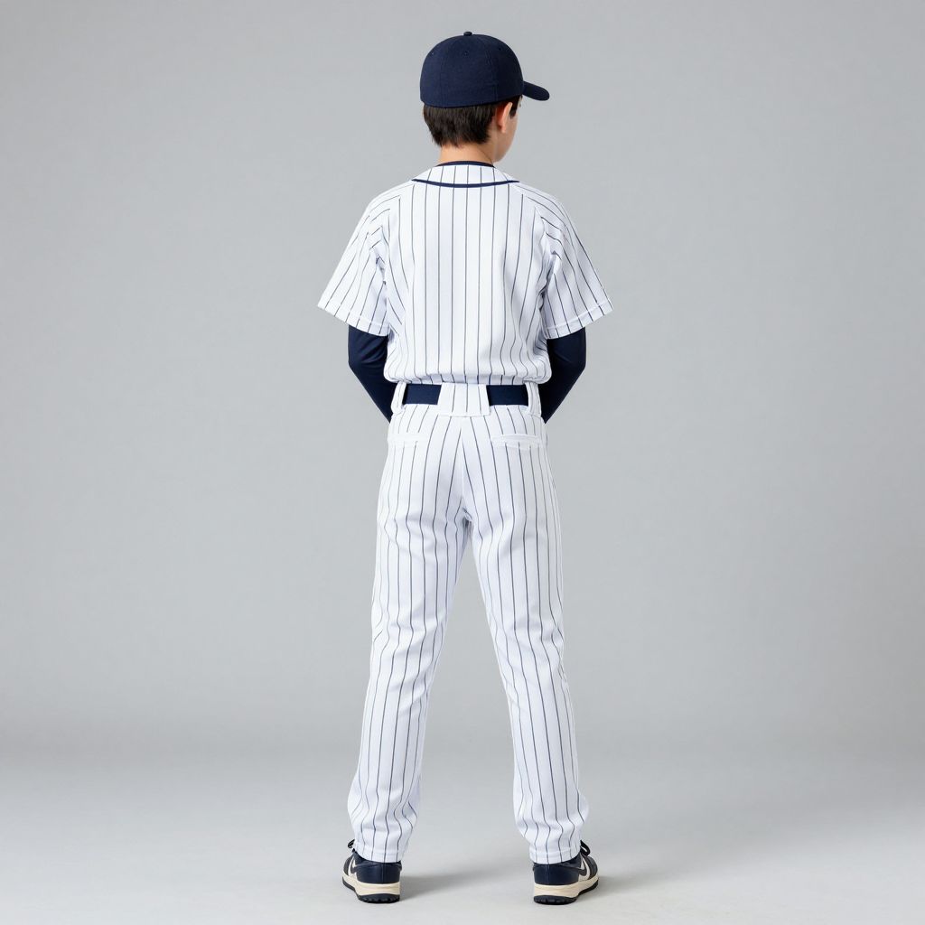 Photograph of a person standing with their back to the camera, wearing a white baseball uniform with black vertical pinstripes, a black baseball cap, and black shoes with white soles. The uniform includes a short-sleeved shirt and matching pants with black belts at the waist. The person's hands are in their pockets. The background is a plain, light gray gradient, creating a minimalist and focused composition. The lighting is even, highlighting the crisp lines of the pinstripes. The overall style is clean and modern.