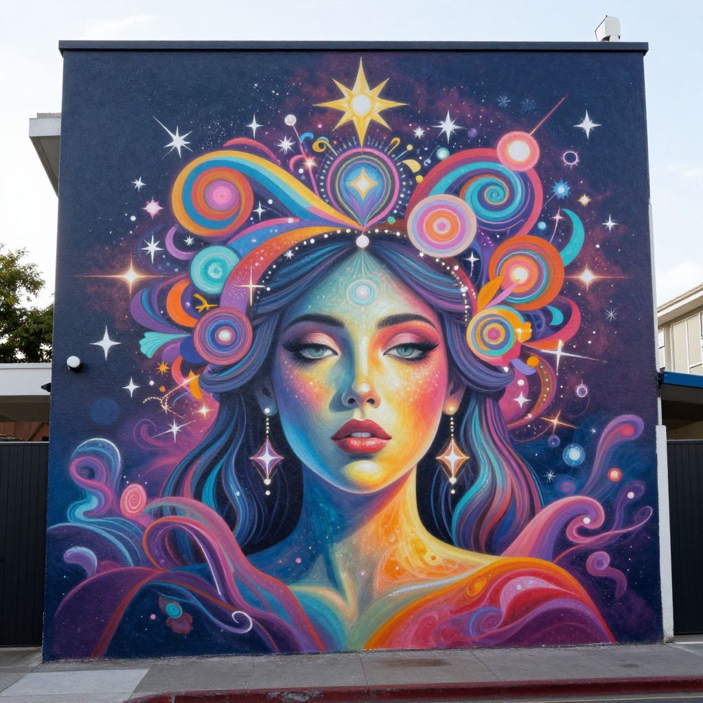 A vibrant mural transforms a street wall into a surreal dreamscape, where a woman's face glows with ethereal hues, adorned with a fantastical headdress of swirling patterns and stars, defying the boundaries of reality and imagination.