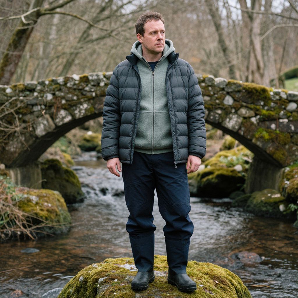 A man, dark gray puffer jacket, zip-up fleece hoodie, navy snow pants, waterproof winter boots, light green base layer, ancient stone bridge, overgrown with moss, tranquil stream flowing beneath, soft light filtering through trees, oversaturated film style, contemplative expression. Man has masculine face and piercing eyes