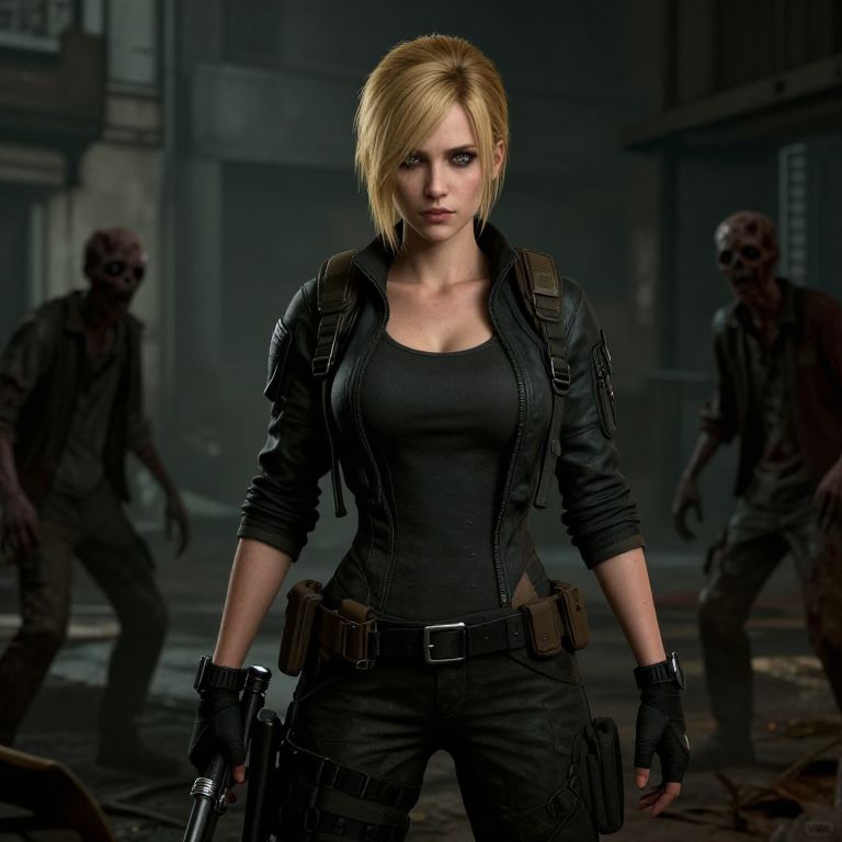 Blonde girl in a post-apocalyptic world inspired by Resident Evil, dressed in tactical gear with a rugged urban background, eerie shadows, and zombies lurking nearby, cinematic lighting highlighting determination on her face.