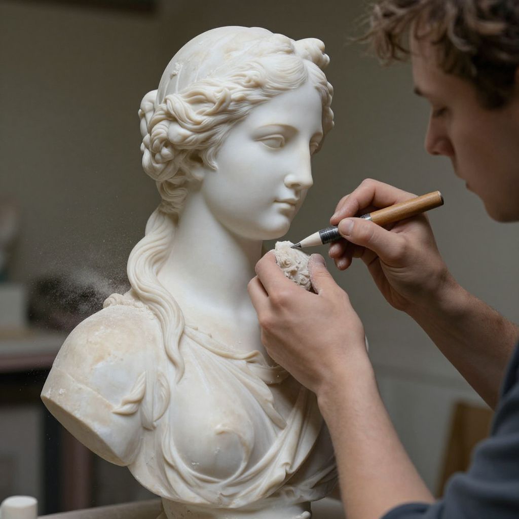 Sculptor meticulously carving intricate details into a classical bust of a woman, her flowing hair and serene expression emerging from the marble as fine dust scatters around the workspace.
