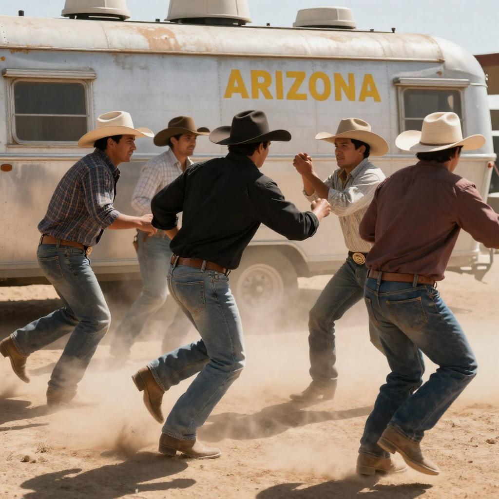Photograph of a dynamic scene: six men in various cowboy outfits, some with hats, are running and fighting near a silver, weathered trailer with "ARIZONA" in yellow letters. Bright sunlight creates a dramatic, dusty effect. One man in a black shirt and jeans is in the foreground, while others are in motion, some with arms raised.