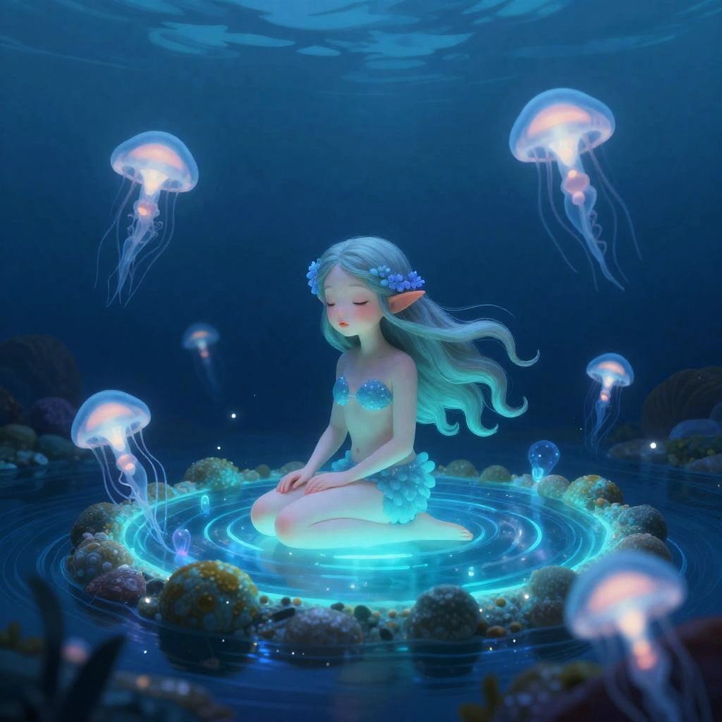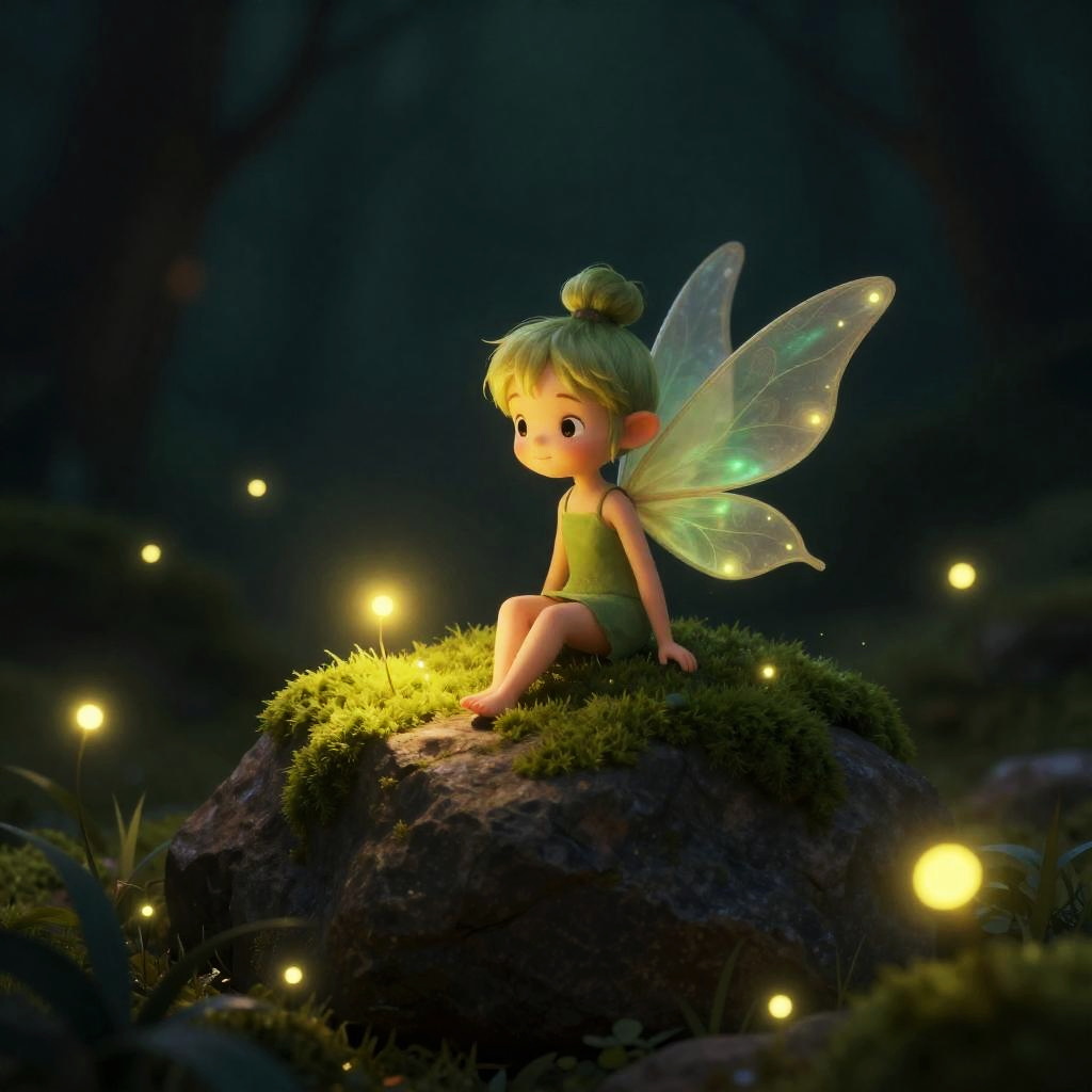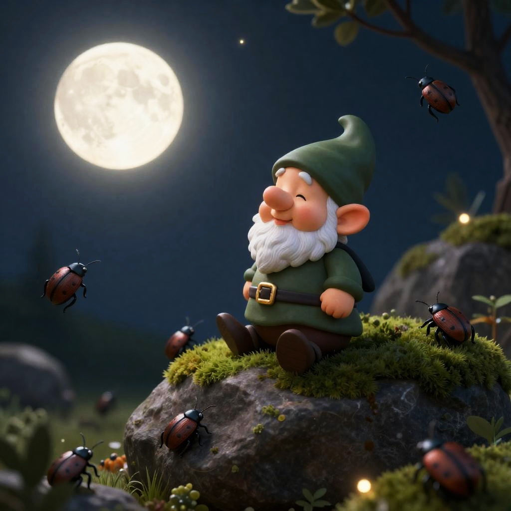 A whimsical illustration of a curious gnome perched on a moss-covered stone, surrounded by shimmering fireflies that create a magical atmosphere.