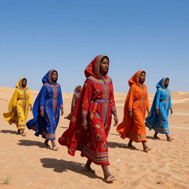 In a vividly rendered digital artwork, a group of figures draped in vibrant, flowing capes traverse a desolate desert landscape, their attire adorned with intricate patterns and bold colors, evoking a sense of movement and mystery against the backdrop of a clear blue sky.