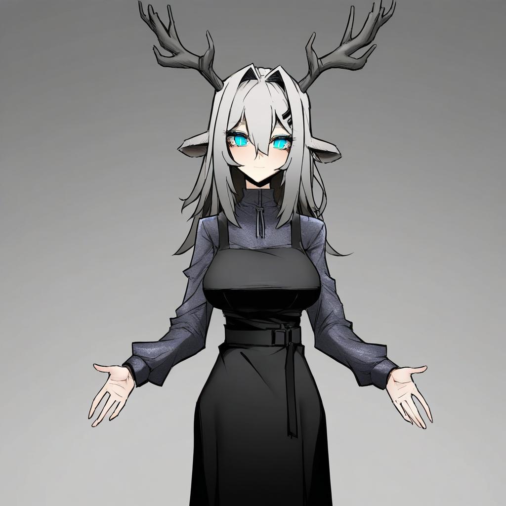 Digital illustration of a female character with deer antlers and ears, long grey hair, and bright blue eyes. She is wearing a black pinafore dress over a long-sleeved grey top. The character has a hairclip and hair strands falling between her eyes, standing against a plain grey background with arms slightly extended.