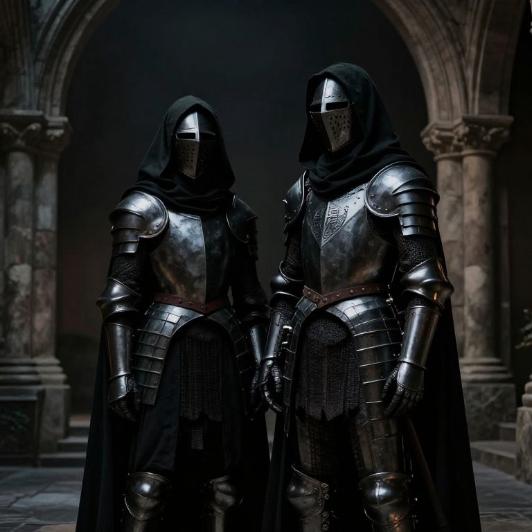 In the hushed embrace of ancient stone arches, two cloaked figures stand as silent sentinels, their dark garments whispering secrets of shadowed truths, while the weight of their armor hums with the burden of duty and the unspoken promise of protection.
