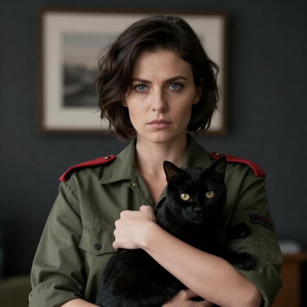 Serious Woman in Military Shirt with Cat
