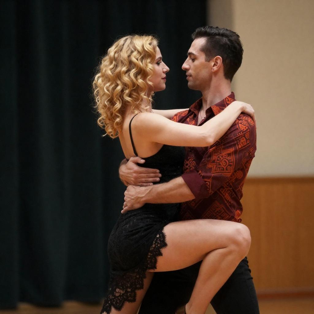 Photograph of a shirtless man with blonde hair and a muscular build, standing with arms raised. A woman with curly brown hair, wearing a red dress and a red headpiece, touches his chest. Dark, grid-like background. Intimate, dramatic lighting.
