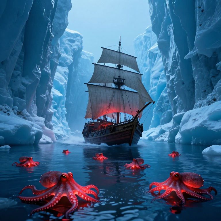 Ancient sailing ships navigate through a narrow icy channel, surrounded by glowing red octopuses that illuminate the serene yet mysterious waters beneath towering blue ice cliffs.