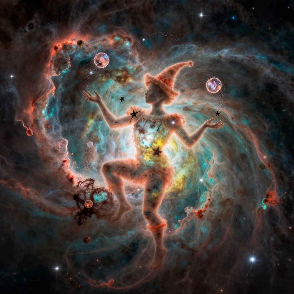 A delicate nebula in deep space, shaped like a whimsical juggler twirling. The form features stars orbiting like juggling balls with shimmering stardust trailing from hands. Rendered in soft hues of coral, turquoise, yellow, with faint nebula lights creating a glowing silhouette that appears as if in motion. The composition is ultra-detailed, with a mystical and dreamlike quality, capturing an otherworldly sense of elegance.