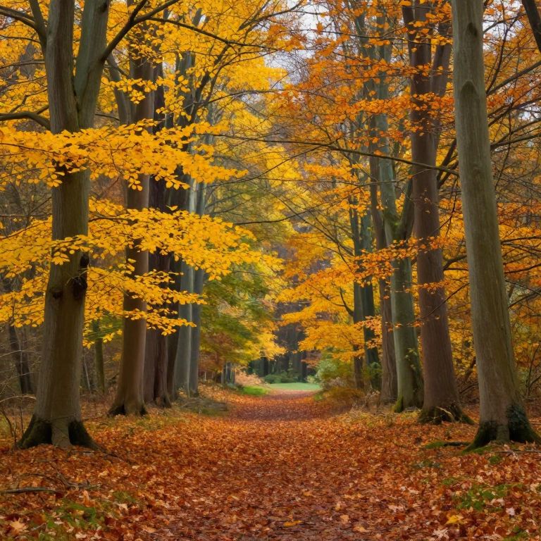 A photograph of a forest pathway in autumn. Tall, straight trees with thick trunks line both sides of the path, their branches adorned with vibrant yellow and orange leaves. The forest floor is carpeted with a thick layer of red and orange fallen leaves, creating a colorful, textured path leading into the distance. The background features a mix of yellow and green foliage, with sunlight filtering through the canopy, casting a warm glow. The image captures the serene beauty and rich colors of the fall season.