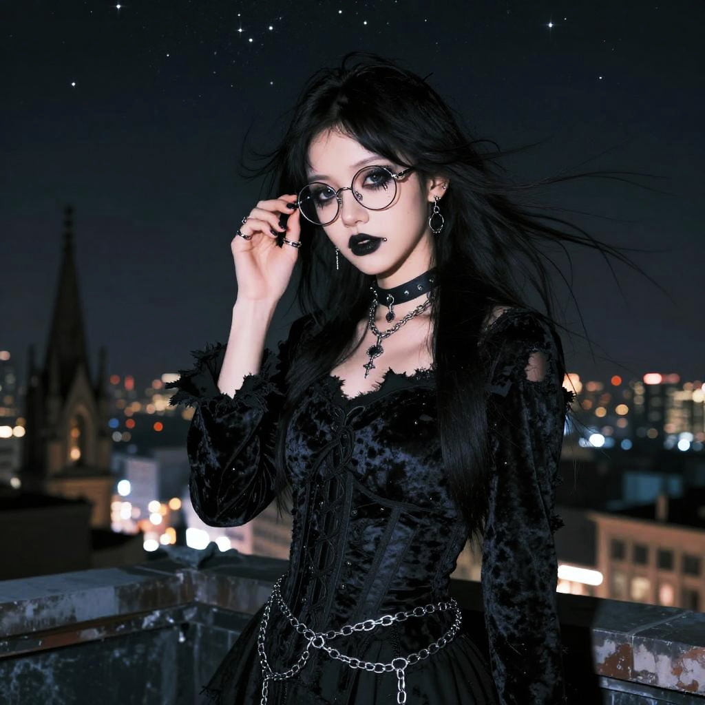 Gothic woman in black lace dress, chain accessories, and black lipstick stands on rooftop at night, adjusting glasses. City lights in background. Digital