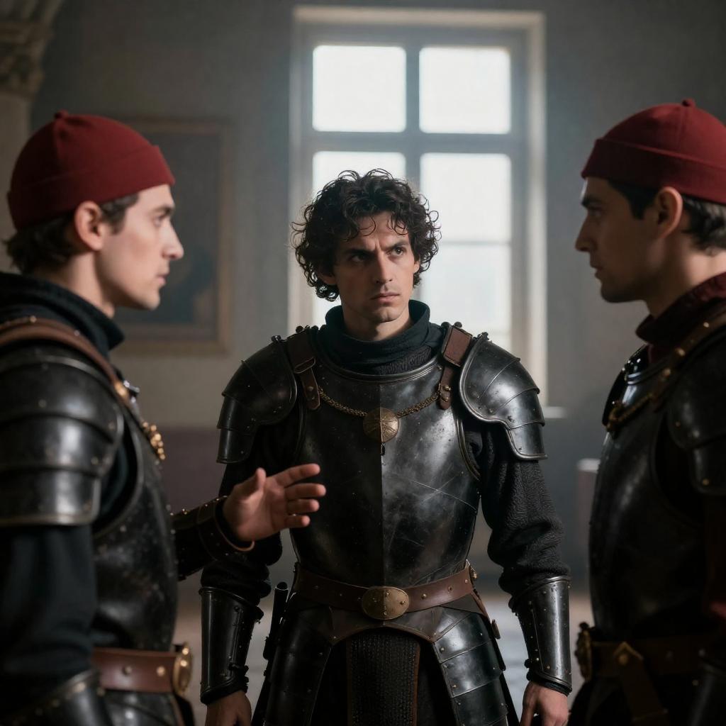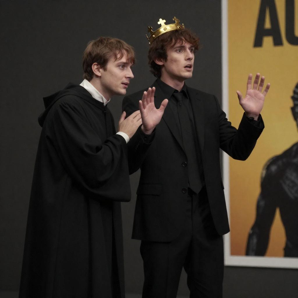 Movie still of two men in dark clothing. Left man, black robe, white shirt, leaning on right man, black suit, crown, alarmed expression. Right man, hands raised, distressed. Dark, ured background. Yellow poster on right. Black creature in lower right.
