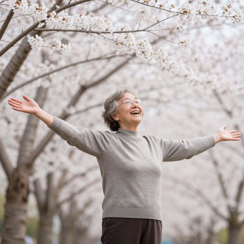 Embracing the boundless joy of spring, an elderly woman stands with arms outstretched beneath blossoming cherry trees, her laughter echoing the renewal of life and the timeless spirit of freedom.