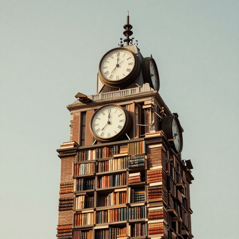 Time whispers secrets atop a tower of knowledge, where each book's spine holds the weight of forgotten moments, and the ticking clock echoes the relentless march of memory and loss.