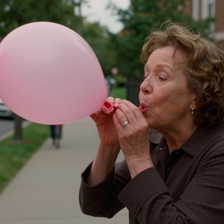 Soundtrack old lady blowing up a pink balloon on sidewalk, in the style of cinematic stills, whiplash curves, patricia piccinini, close up, poolcore, official art, movie still,