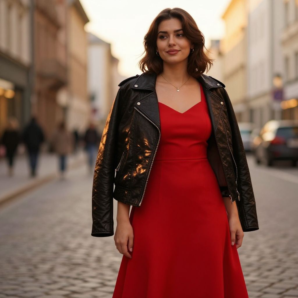 Chic red dress with leather jacket, romantic city background during golden hour, soft focus on smiling woman standing on cobblestone street, warm lighting reflecting off jacket and dress fabric, blend of casual and glamorous streetwear.