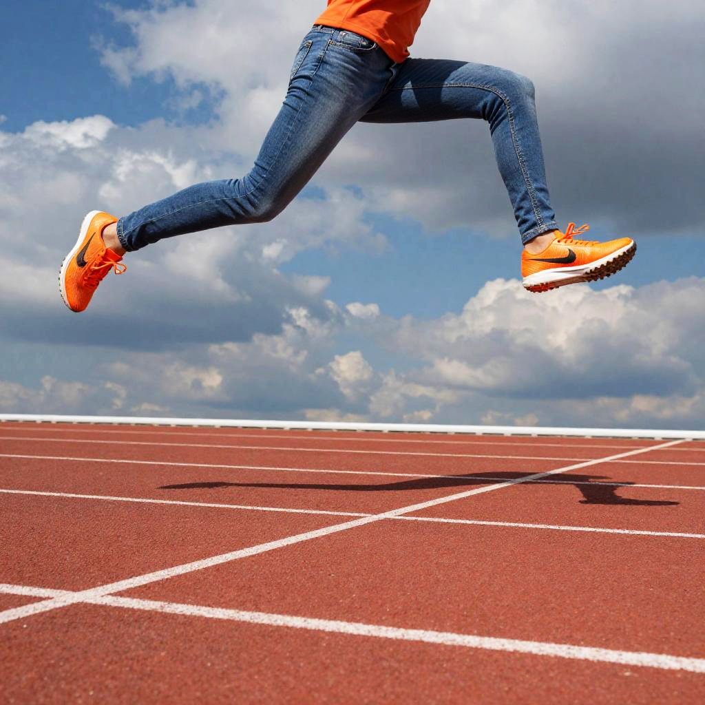 Photograph of a person mid-jump over a red track lane marker. The athlete, wearing blue jeans and an orange sleeveless top, has one leg extended forward and the other bent, showcasing vibrant orange running shoes. The background is a dramatic, cloudy blue sky. The track's texture is visible, with the marker's white line sharply contrasting against the red surface. The image has a dynamic, action-packed feel.