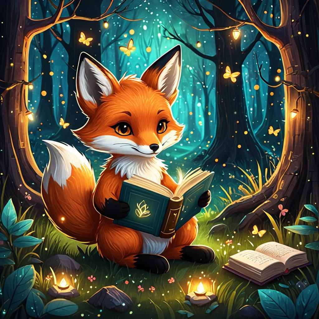 Adorable chibi fox reading a tiny book in an enchanted forest clearing with ancient trees and twinkling lights, rendered in delicate digital painting with vibrant colors and subtle brush strokes with glowing fireflies and a gentle warm color palette.
