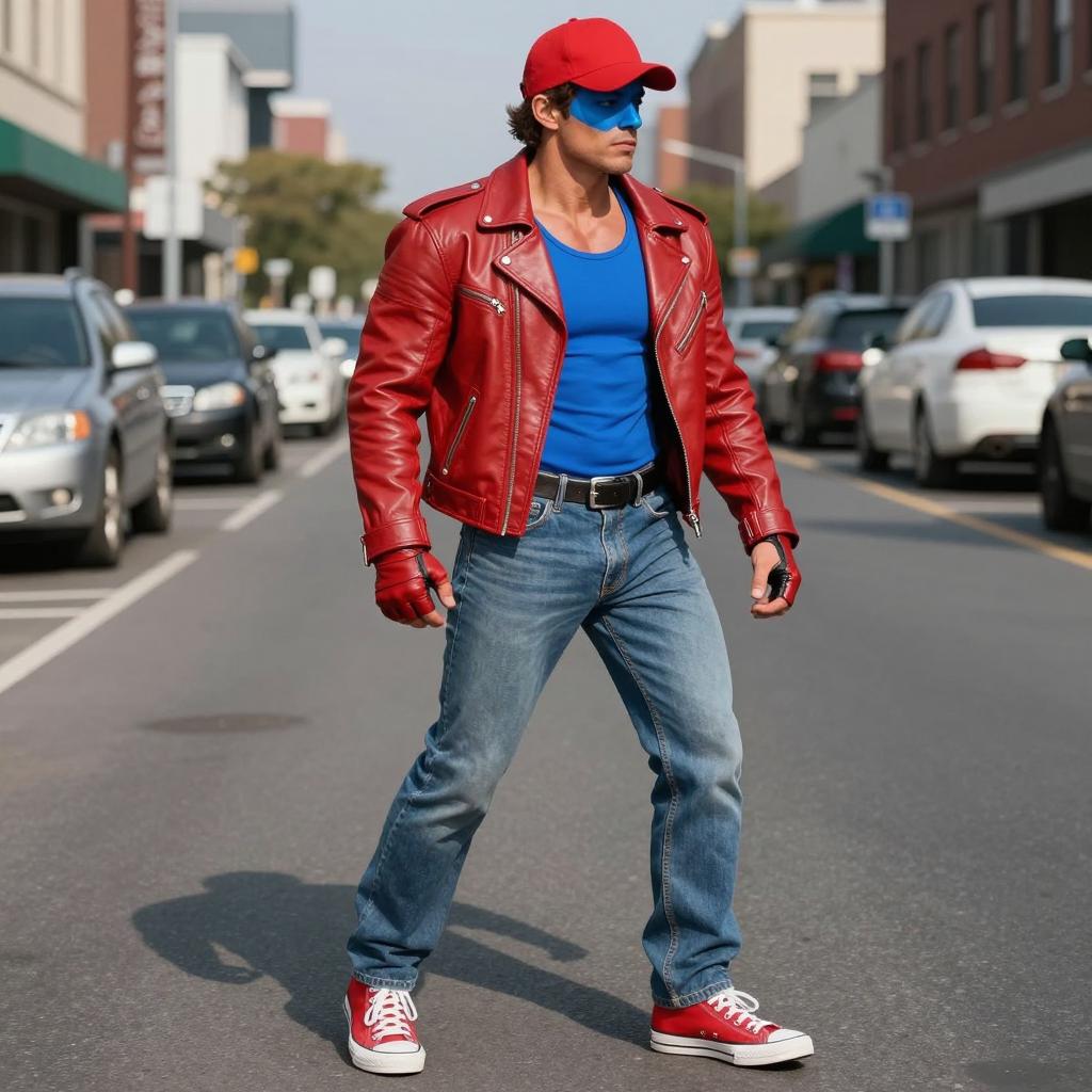 Terry bogard outfit, photorealistic, male character, muscular build, standing on urban street, daytime, blue face paint, red leather jacket, blue jeans, red sneakers, red baseball cap, blue tank top, fingerless gloves, street background, cars parked, sunny, city buildings, realistic shadows, anime-inspired style, vibrant colors, detailed ures, urban street setting, confident pose, mid-action, slight forward lean, casual attire