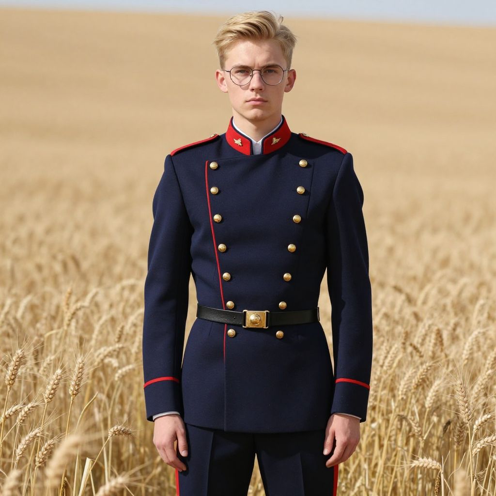 A young man with blond hair and glasses is dressed in a detailed navy blue military-style uniform featuring red accents and gold buttons. He stands confidently in a golden wheat field, creating a striking contrast between the formal attire and the natural background in a high-quality, realistic photograph.