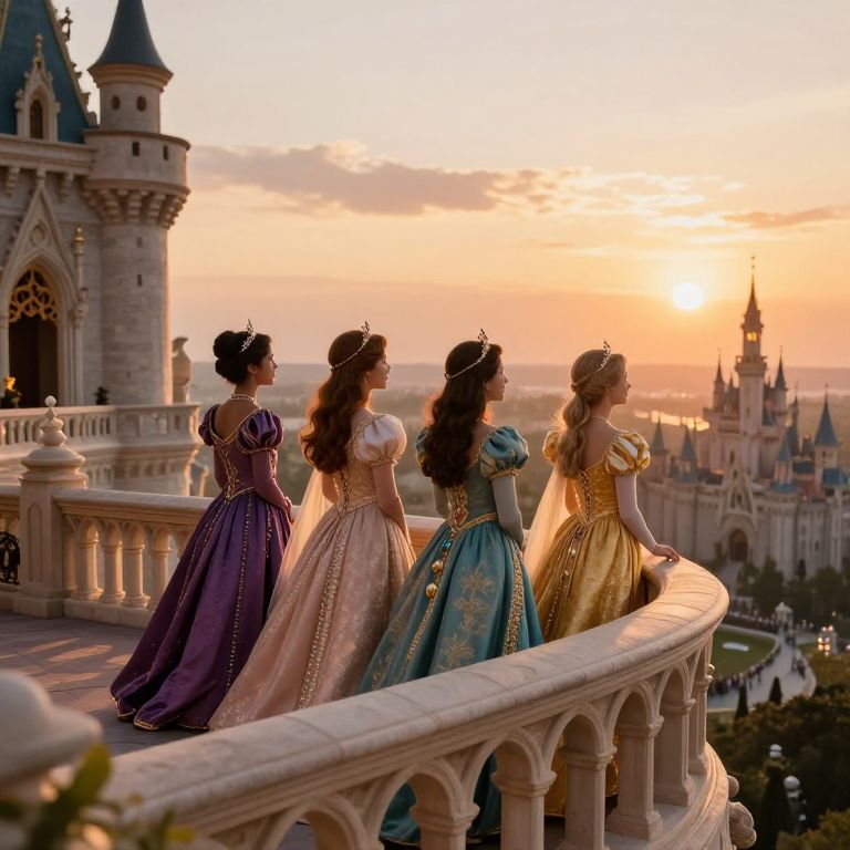 Four princesses in elaborate ball gowns stand on a castle balcony, watching a sunset over a magical kingdom. Digital art.