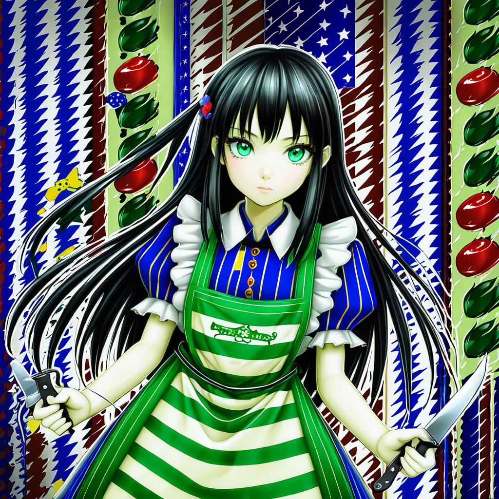 Anime-style illustration of a girl with long black hair and striking green eyes. She wears a blue dress with yellow stripes and a white collar, covered by a green and white striped apron. The character holds two knives, one in each hand, and is set against a colorful patterned background featuring vertical stripes and floral motifs. Inspired by the theme of American McGee's Alice and drawn in a detailed anime art style.