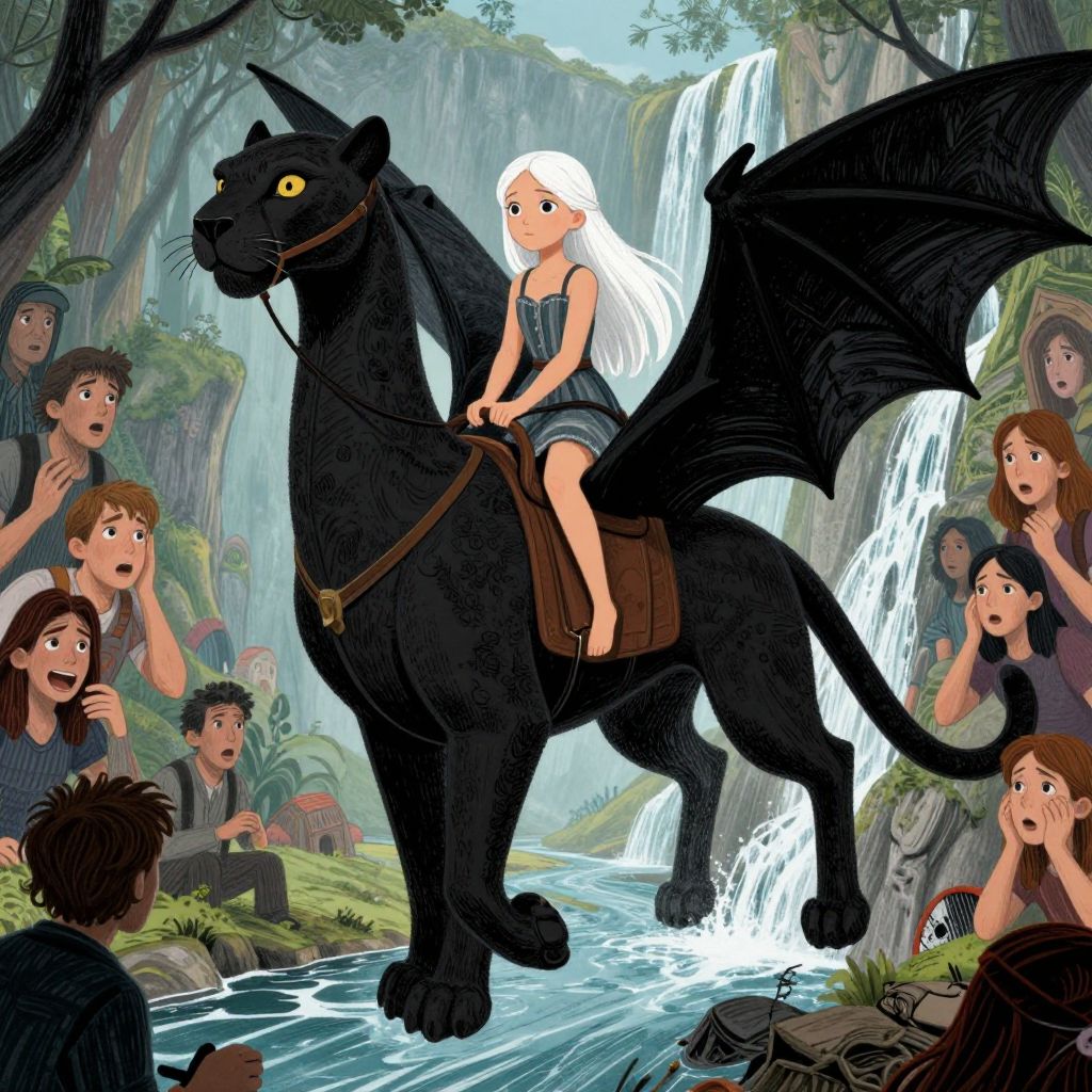 Digital illustration of a white-haired woman with blue eyes riding a black, winged, panther-like creature with glowing yellow eyes. She wears a black dress and sits confidently on the creature's brown leather saddle. The background features a lush, forested waterfall scene with cascading water, moss-covered rocks, and various people in medieval clothing, some watching in awe and others conversing. The scene is vibrant with greens, blues, and earthy tones, highlighting the fantastical and adventurous atmosphere. The woman's long white hair contrasts sharply with the dark panther.
