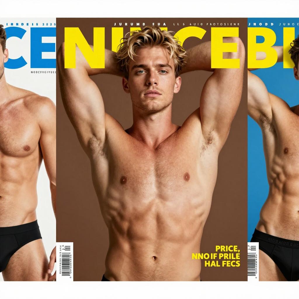 Photograph of three adult magazine covers. Central cover features a shirtless, blonde, muscular man with light skin, arms raised, against a brown ured background. Left cover shows a partially visible man's torso and black briefs. Right cover displays a partially visible muscular man's chest and blue . All covers have bold yellow and blue .