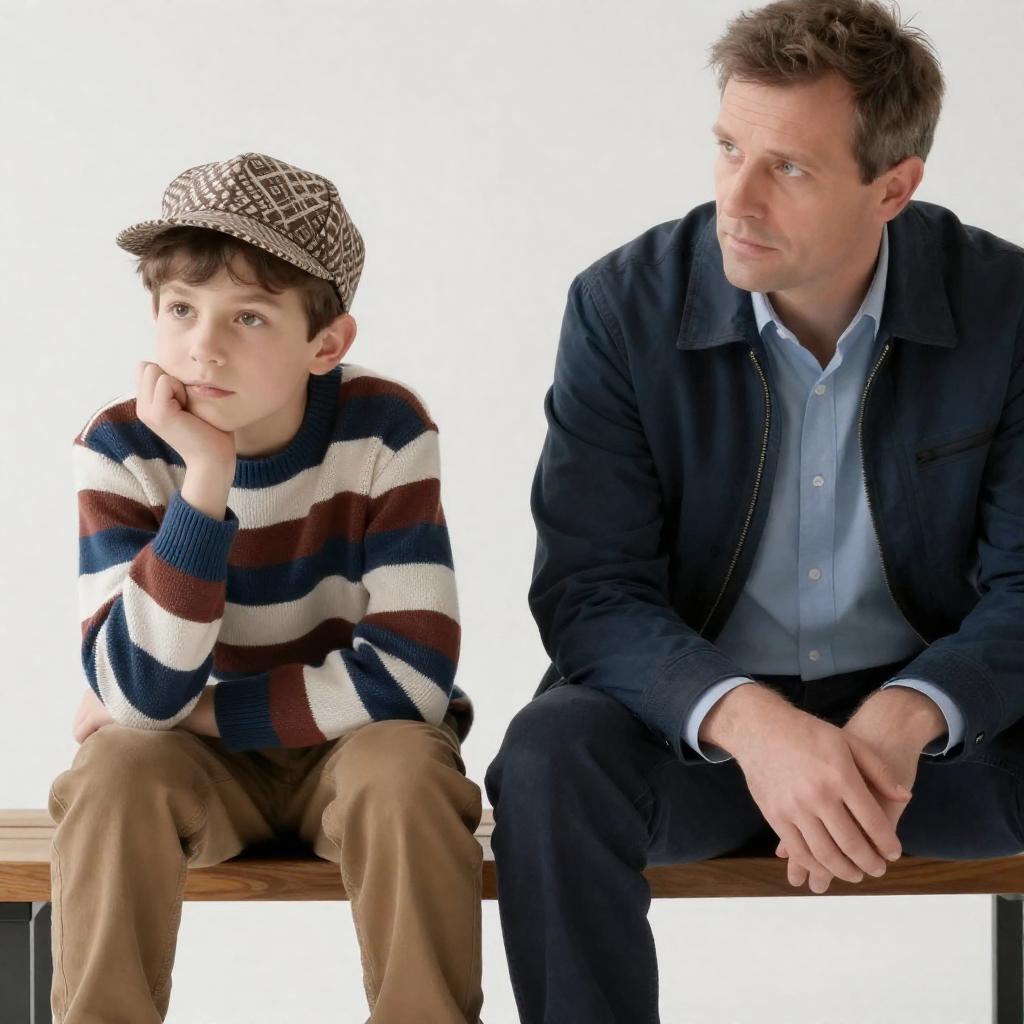 Photograph of two people sitting on a wooden bench. Young boy on left wears brown and white patterned hat, striped sweater, and brown pants, resting chin on hand, looking away. Older man on right wears dark blue jacket, blue shirt, and dark pants, looking to the side with hands clasped. Background is white. Boy has fair skin, short brown hair, intense gaze. Man has light skin, short brown hair, neutral expression.