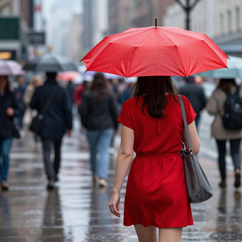 Photograph of a woman in a red dress holding a red umbrella, walking in a rainy city street, surrounded by blurred pedestrians.