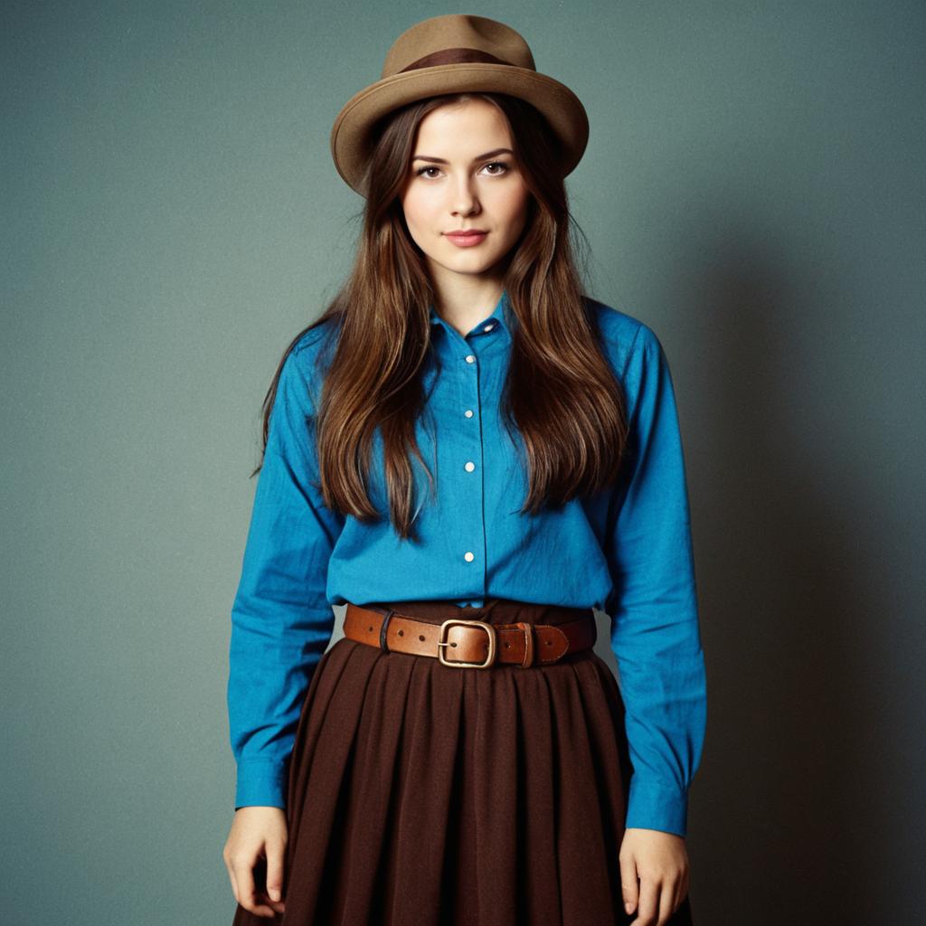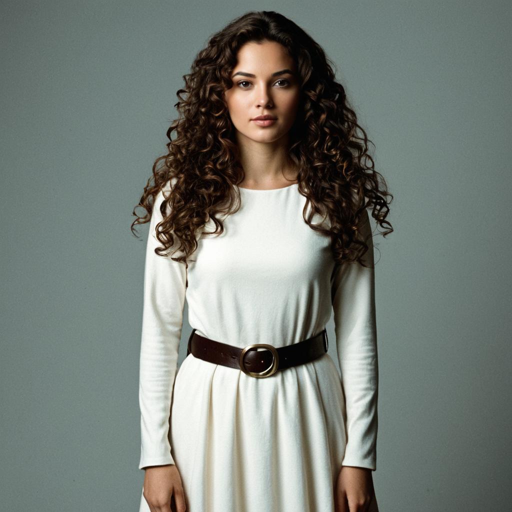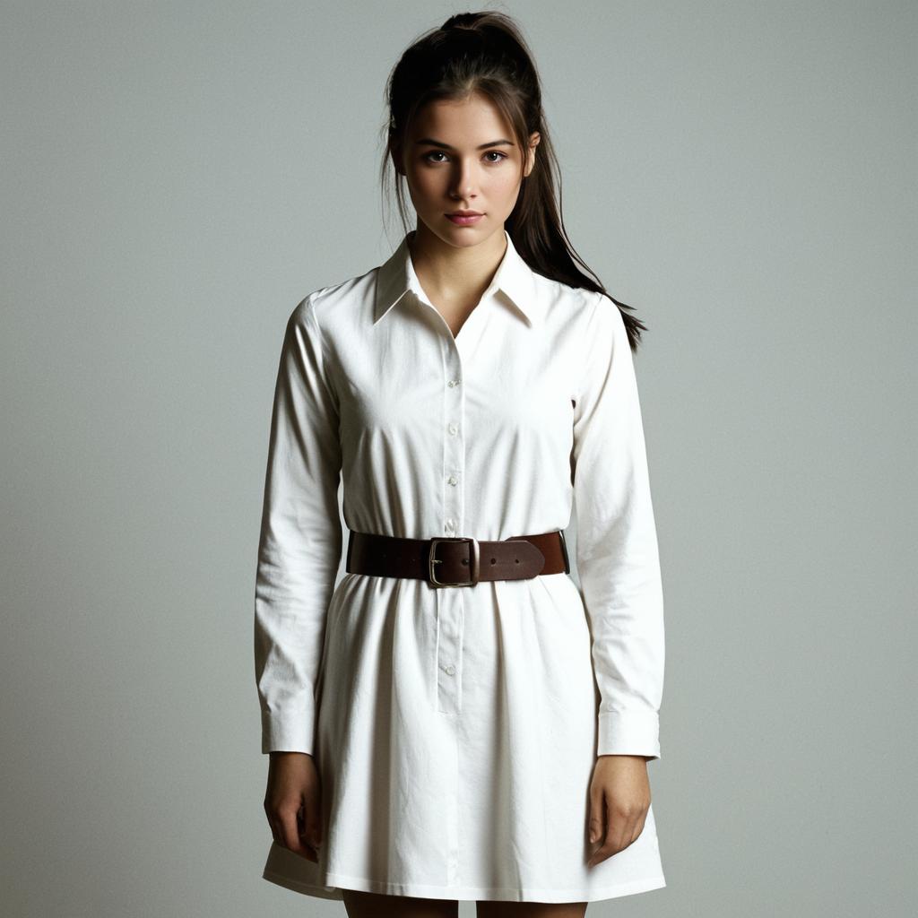 Portrait of a young woman with long brown hair wearing a white short-sleeve dress with a brown belt. She is standing with her arms at her sides against a plain gray background, displaying a modest and simple attire often associated with traditional or conservative dress codes.