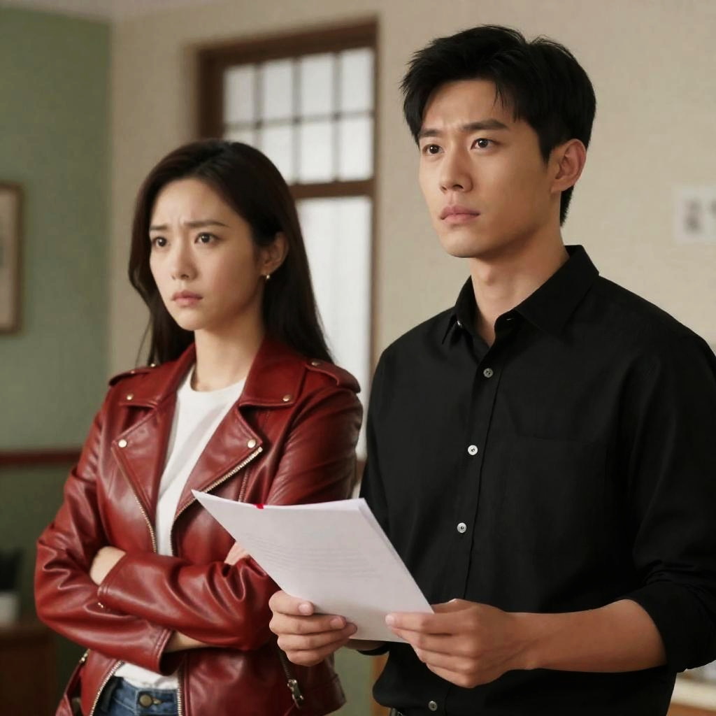 Photograph of two people. Man in black shirt holding paper with red object, serious expression. Woman in red leather jacket, arms crossed, concerned expression. Background: green and beige walls, window with grid pattern. Both looking to the left.