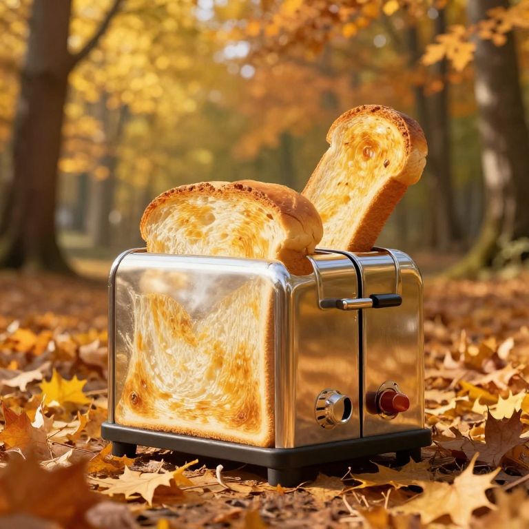 Giant toasters with golden bread slices protruding as ears stand amidst a serene autumn forest, surrounded by falling leaves and bathed in warm sunlight.
